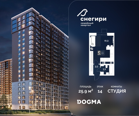 Срок сдачи: 4 кв. 2027, общей площадью 25.9 кв.м., на 14 этаже.