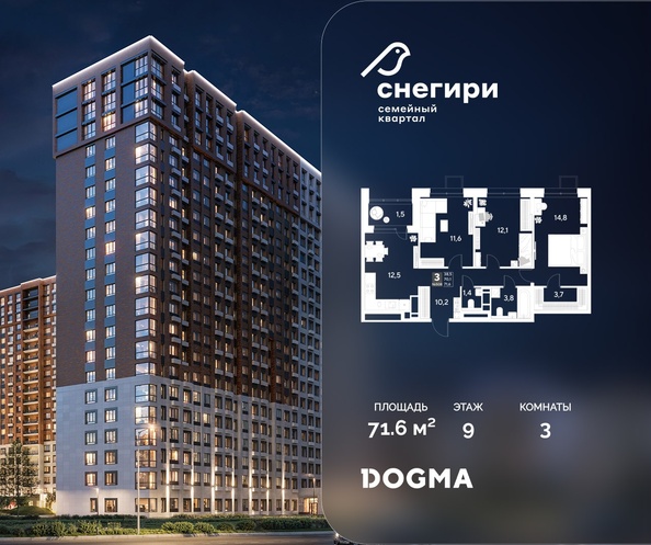 Срок сдачи: 4 кв. 2027, общей площадью 71.6 кв.м., на 9 этаже.
