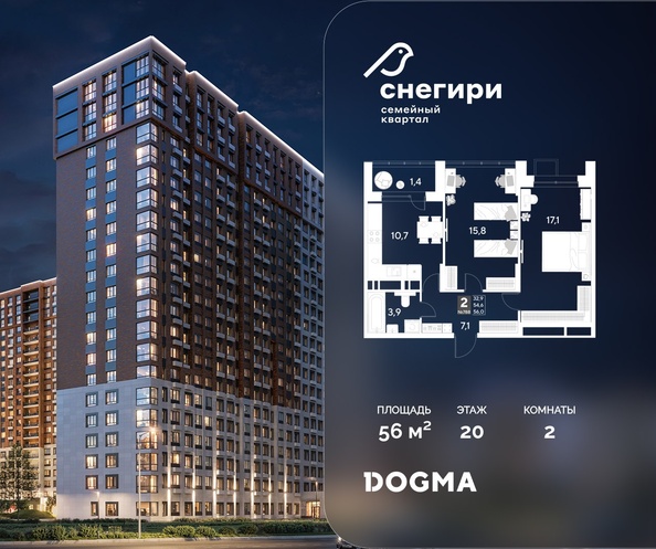 Срок сдачи: 4 кв. 2027, общей площадью 56 кв.м., на 20 этаже.