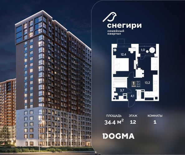 Срок сдачи: 4 кв. 2027, общей площадью 34.4 кв.м., на 12 этаже.