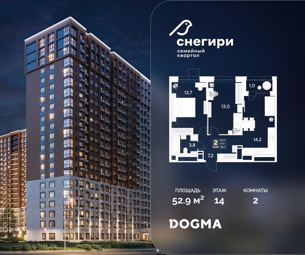 Срок сдачи: 4 кв. 2027, общей площадью 52.9 кв.м., на 17 этаже.
