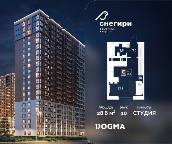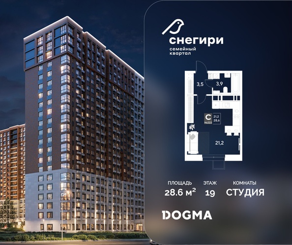 Срок сдачи: 4 кв. 2027, общей площадью 28.6 кв.м., на 19 этаже.