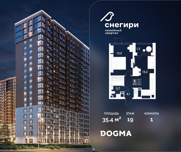 Срок сдачи: 4 кв. 2027, общей площадью 35.4 кв.м., на 19 этаже.