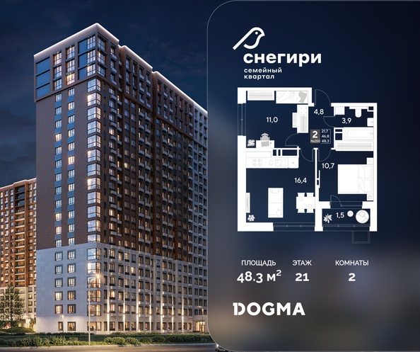 Срок сдачи: 4 кв. 2027, общей площадью 48.3 кв.м., на 19 этаже.