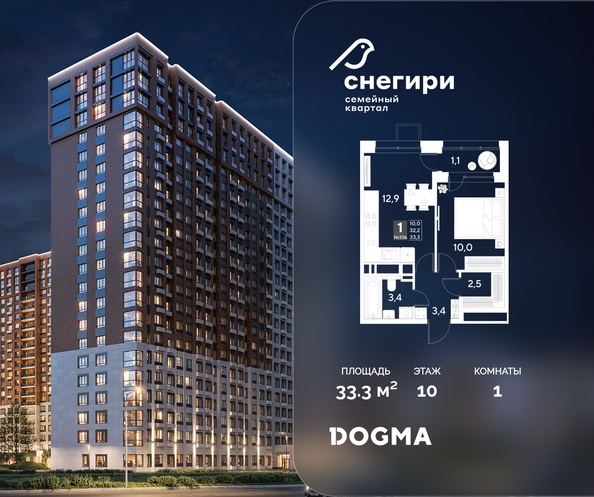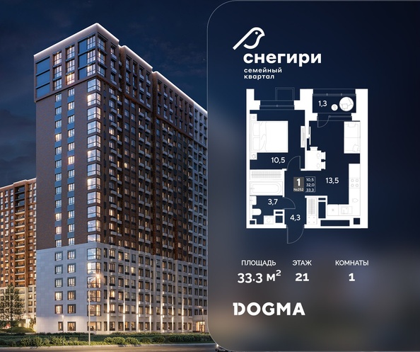 Срок сдачи: 4 кв. 2027, общей площадью 33.3 кв.м., на 21 этаже.