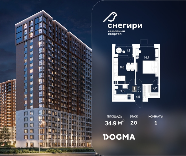 Срок сдачи: 4 кв. 2027, общей площадью 34.9 кв.м., на 20 этаже.