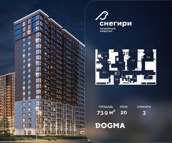 Срок сдачи: 4 кв. 2027, общей площадью 73.9 кв.м., на 20 этаже.