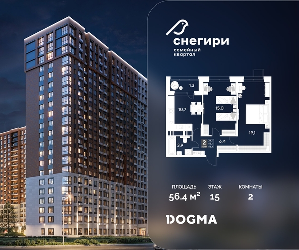 Срок сдачи: 4 кв. 2027, общей площадью 56.4 кв.м., на 15 этаже.