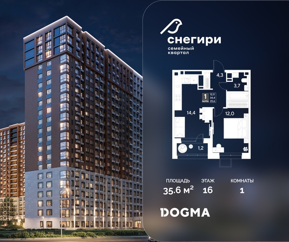 Срок сдачи: 4 кв. 2027, общей площадью 35.6 кв.м., на 16 этаже.