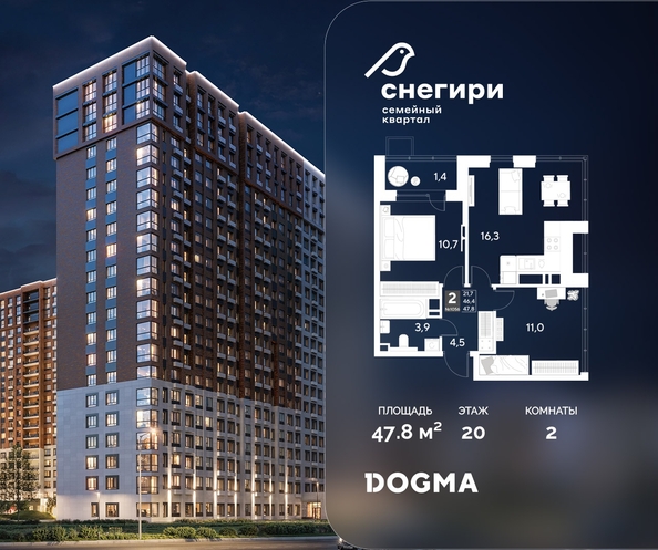 Срок сдачи: 4 кв. 2027, общей площадью 47.8 кв.м., на 20 этаже.
