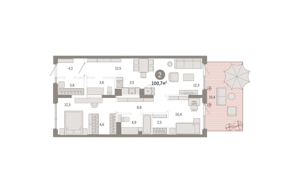 Квартира с кухней-гостиной и двумя спальнями в Кварталах Драверта. Особенности планировки: гардеробная, окна в пол, отдельный вход, панорамное остекление, свободная планировка, терраса.