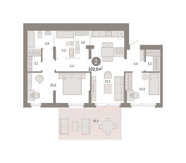 Квартира с кухней-гостиной и двумя спальнями в Кварталах Драверта. Особенности планировки: гардеробная, окна в пол, вид во двор, панорамное остекление, разнесённые спальни, предчистовая отделка, мастер-спальня, терраса, постирочная.