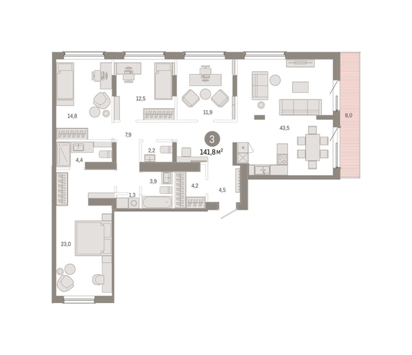 Квартира с кухней-гостиной и тремя спальнями в Кварталах Драверта. Особенности планировки: вид во двор, предчистовая отделка, постирочная, терраса на крыше.