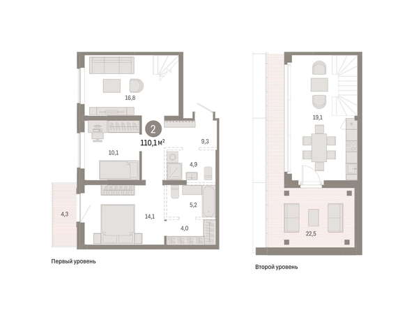 Двухуровневая квартира с кухней-гостиной и двумя спальнями в Кварталах Драверта. Особенности планировки: гардеробная, двухуровневая, вид во двор, панорамное остекление, предчистовая отделка, мастер-спальня, балкон, терраса на крыше.