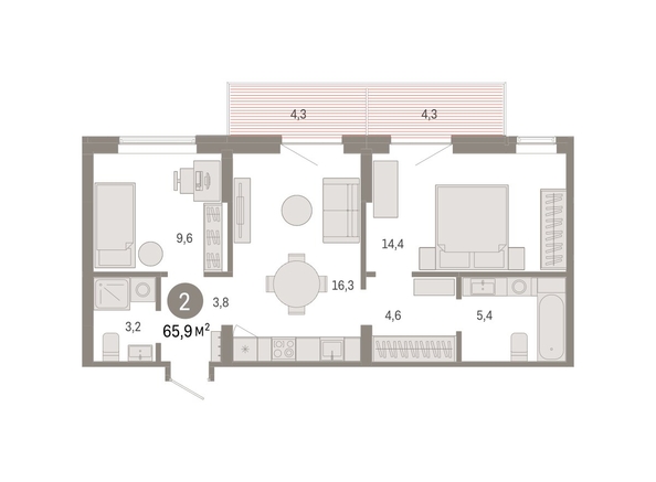Квартира с кухней-гостиной и двумя спальнями в Кварталах Драверта. Особенности планировки: гардеробная, вид во двор, разнесённые спальни, предчистовая отделка, мастер-спальня, балкон.