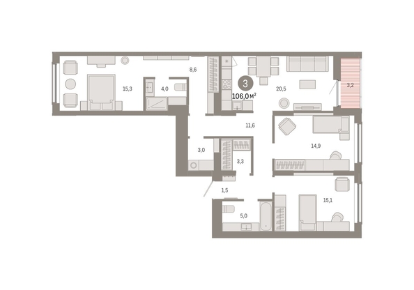 Квартира с кухней-гостиной и тремя спальнями в Кварталах Драверта. Особенности планировки: окна на две стороны, гардеробная, вид во двор, тёплая лоджия, разнесённые спальни, предчистовая отделка, мастер-спальня, постирочная.