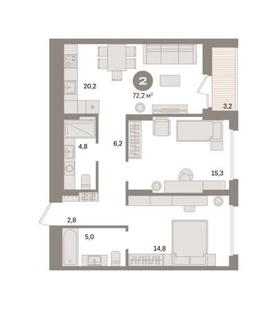 Квартира с кухней-гостиной и двумя спальнями в Кварталах Драверта. Особенности планировки: вид во двор, тёплая лоджия, предчистовая отделка, мастер-спальня.