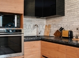 Ремонт: ремонт выполнен с полной заменой всех инженерных систем с использованием дорогостоящих материалов. Произведено утепление стен и подоконников. Вся сантехника и инсталляция — Hansgrohe (Германия). Душевая кабина на заказ из калёного стекла, стены облицованы европейским керамогранитом. Кухонный гарнитур со встроенной техникой. Вместительный шкаф-купе в прихожей. Вся мебель изготовлена по индивидуальному заказу. На полу — дорогой ламинат, установлены натяжные потолки. Балкон утеплён, остеклён и обшит декоративным кирпичом, есть дополнительный шкаф для хранения. На окнах — жалюзи.