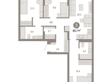 Квартира с кухней-гостиной и тремя спальнями в Кварталах Драверта. Особенности планировки: балкон, окна на две стороны, предчистовая отделка, разнесённые спальни.