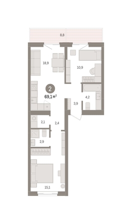 Квартира с кухней-гостиной и двумя спальнями в Кварталах Драверта. Особенности планировки: балкон, вид во двор, гардеробная, мастер-спальня, постирочная, предчистовая отделка, разнесённые спальни.