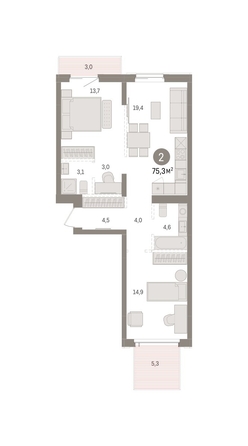 Квартира с кухней-гостиной и двумя спальнями в Кварталах Драверта. Особенности планировки: балкон, вид во двор, гардеробная, мастер-спальня, разнесённые спальни, свободная планировка, терраса, терраса на крыше.